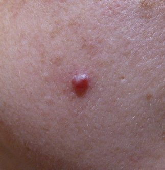 Cherry angiomas are very common small cherry-red lumps usually the size of a pin head which may grow slowly to the size of a match head. In contrast to pyogenic glanulomas they rarely cause discomfort and only require treatment for cosmetic reasons. They respond well to laser treatment.