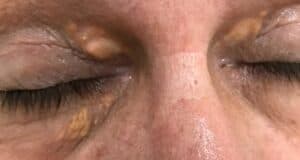 Xanthelasma is usually located around the upper eyelid. Upper and lower eyelids can be affected symmetrically.