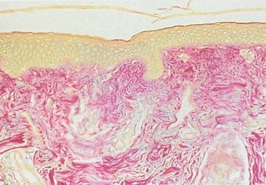 - Abnormal-appearing elastic fibres in the dermis.